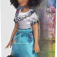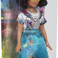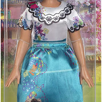 Disney Encanto Mirabel Core Fashion Doll comes wearing her signature outfit and accessories! Just like in the film, Mirabelâs dress have a beautiful collar and sleeves. Her long teal skirt features colourful icons and patterns inspired by her familyâs magical gifts, just like in the film!